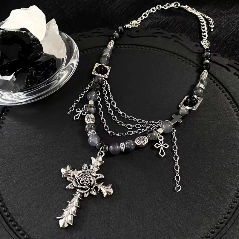 Y2g dark cross rose tassel necklace niche design Natural Stone black glitter stone beaded clavicle chain