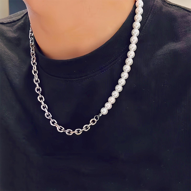 Ins European and American Punk Style Pearl Square Pendant Spliced Titanium Steel Necklace for Men and Women Niche Trendy Light Luxury Hip-Hop Sweater Chain