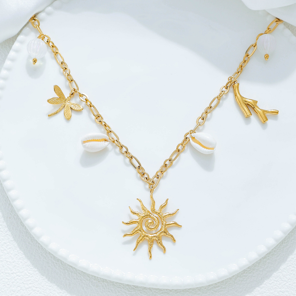 Hawaiian Resort Style Sun Shell Dragonfly Coral Beads Multi-Pendant Necklace 18K Gold Plated Stainless Steel Jewelry