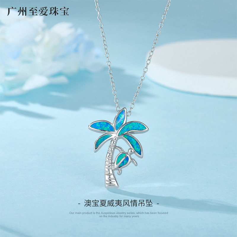 European and American Blue Opal Hawaiian Coconut Tree Necklace Copper Silver Opal Inlaid Pendant Tropical Style Women's Necklace Customization
