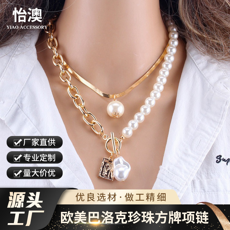 European and American Fashion Hangers Retro New Copper Snake Chain Necklace Baroque Pearl Square Brand Necklace Set Chain