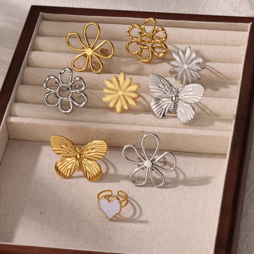 18K gold-plated stainless steel exquisite flower series butterfly ring European and American trend jewelry personalized elegant hand jewelry