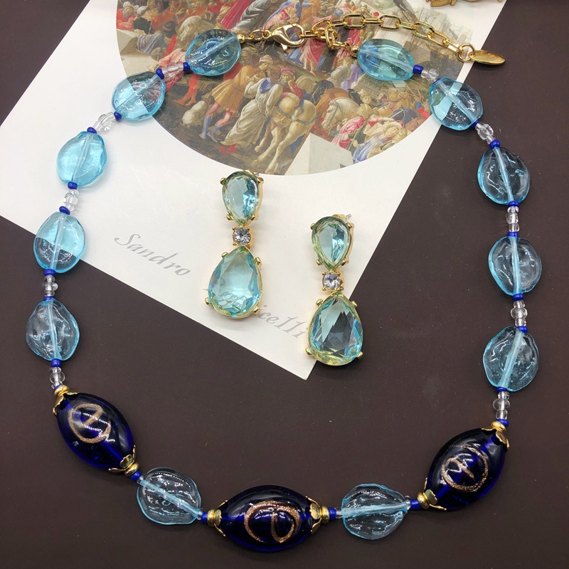 Hawaiian Style Ocean Series Necklace Earrings Vintage Fresh Ice Blue Glass Necklace Crystal Earrings Set