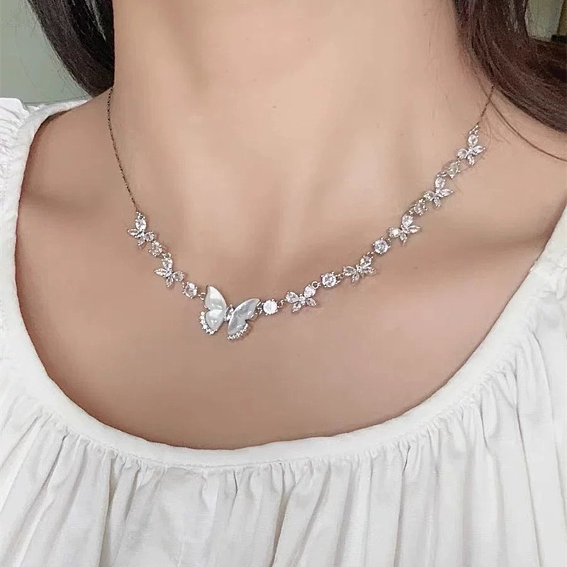 Light Luxury Zircon White Fritillaria Butterfly Necklace Summer New Hot Style Clavicle Chain Women's High-end Choker All-match Necklace