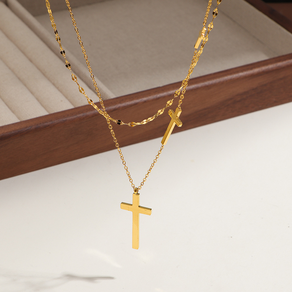 Titanium Steel Double-Layer Cross Necklace Popular High-End Accessible Luxury Niche Clavicle Sweater Chain Plated with 18K Gold Does Not Fade