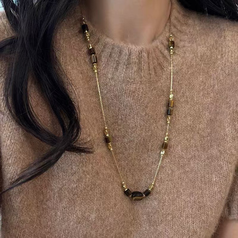Exquisite and Fashionable Maillard brown Tiger Eye Snake Bone Chain Necklace High-grade Niche Women's Metal Long Woolen Chain