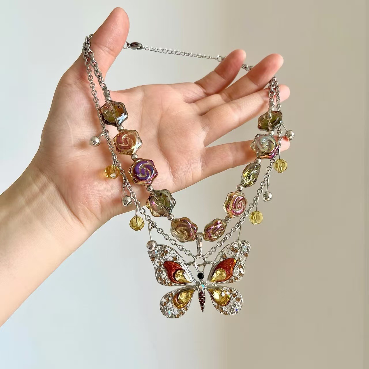 Vintage Retro Colorful Butterfly Beaded Necklace Women's Maillard Crystal Clavicle Chain Accessible Luxury High-End Accessories