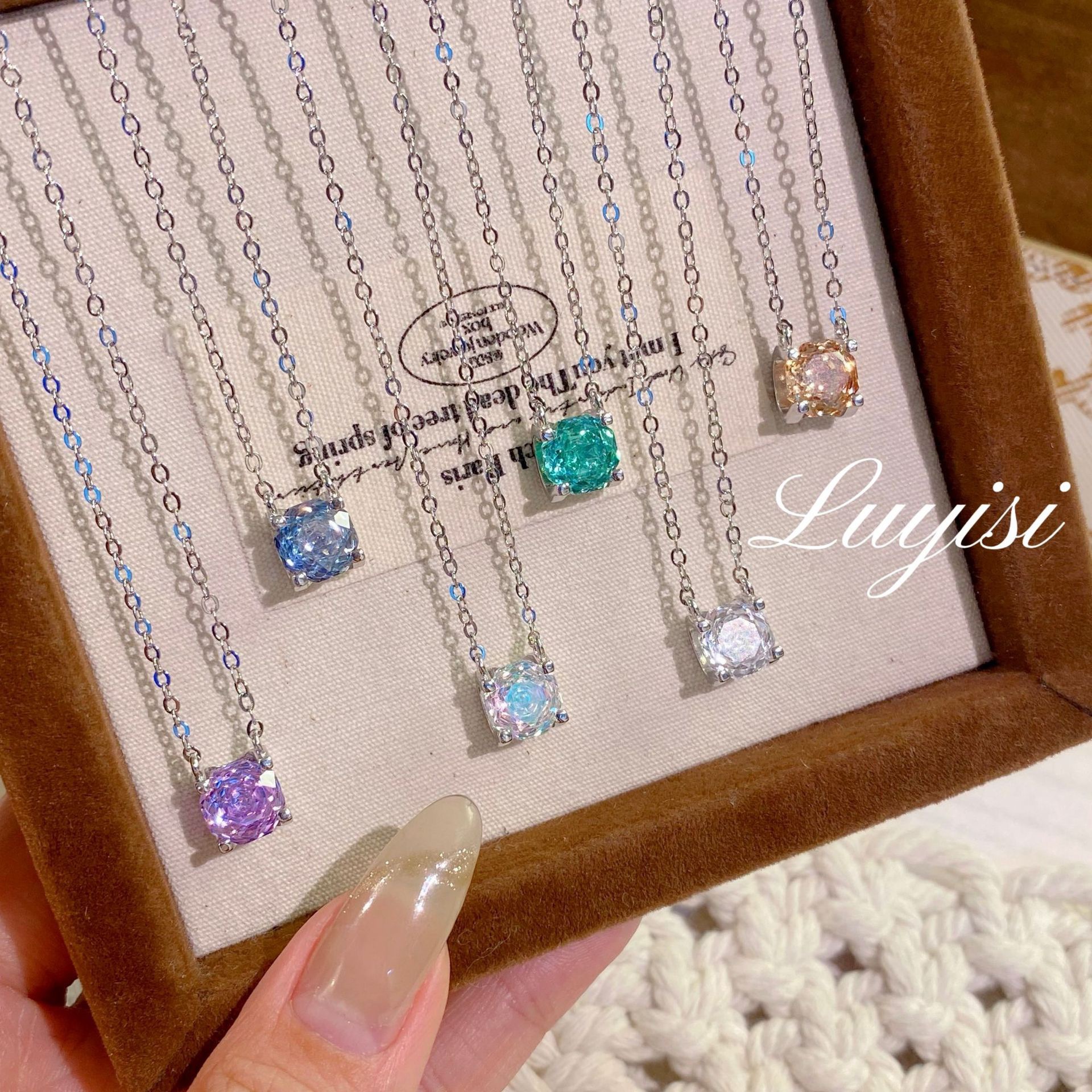 Ins Square Colorful Gemstone Necklace, Thin Clavicle Chain, Summer Necklace, Light Luxury Niche High-End Neck Chain for Women