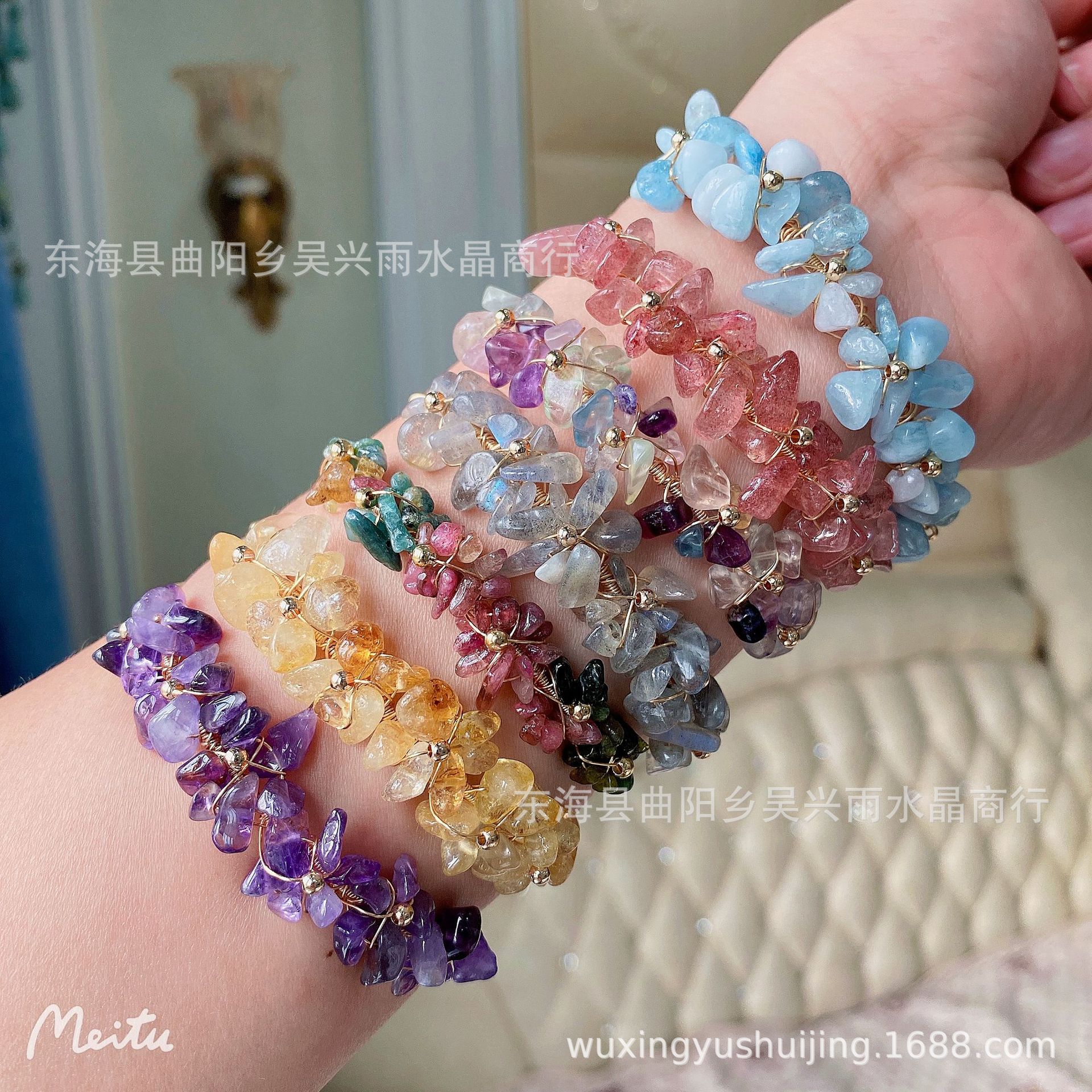 14K Gold Wound Color Green Fluorite Aquamarine Tourmaline Citrine Lavolite Strawberry Crystal Gravel Bracelet
