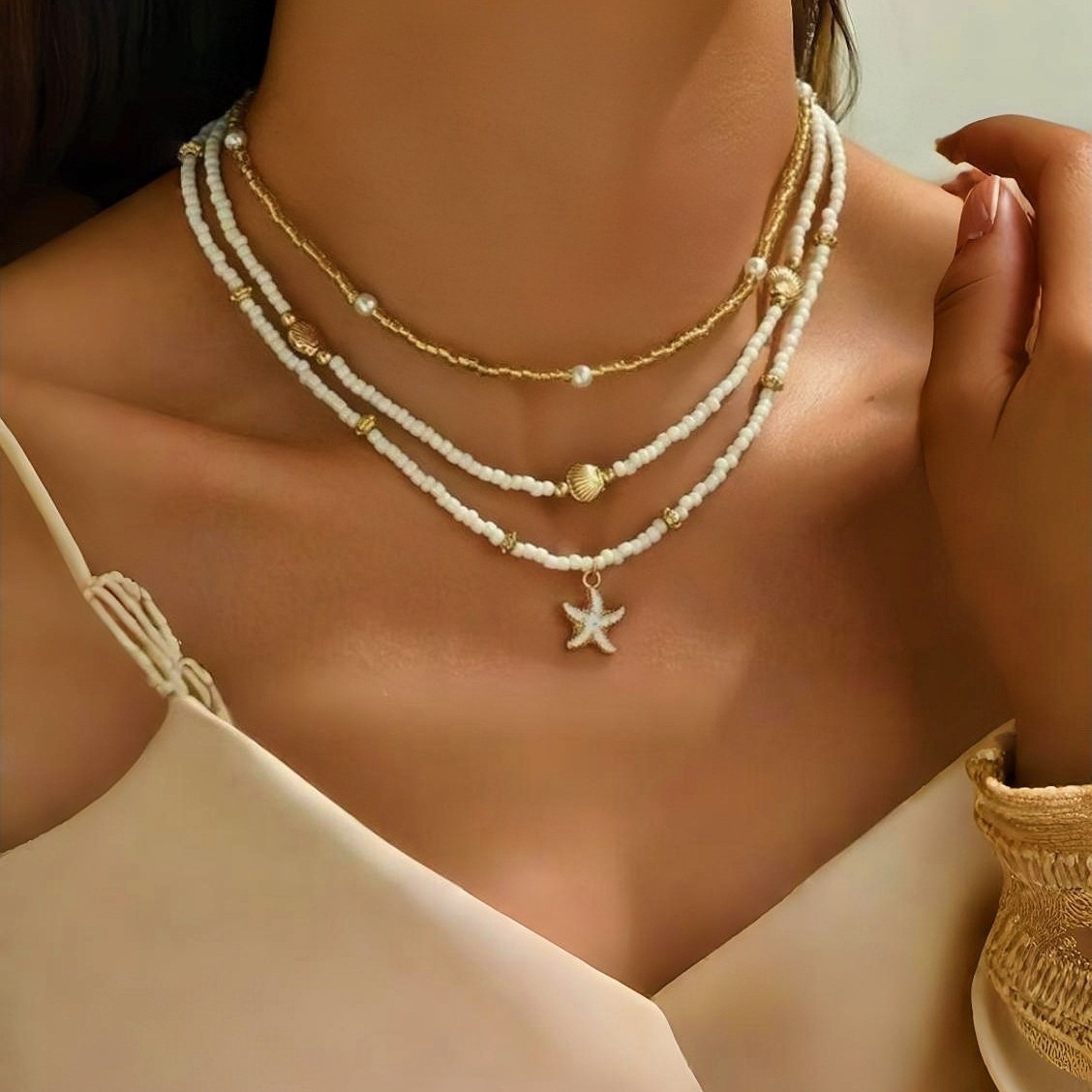 European and American Cross-Border Ocean Style Oil-Dropping Starfish Shell Scallop Imitation Pearl Necklace Women's Personalized Simple Stacking Necklace