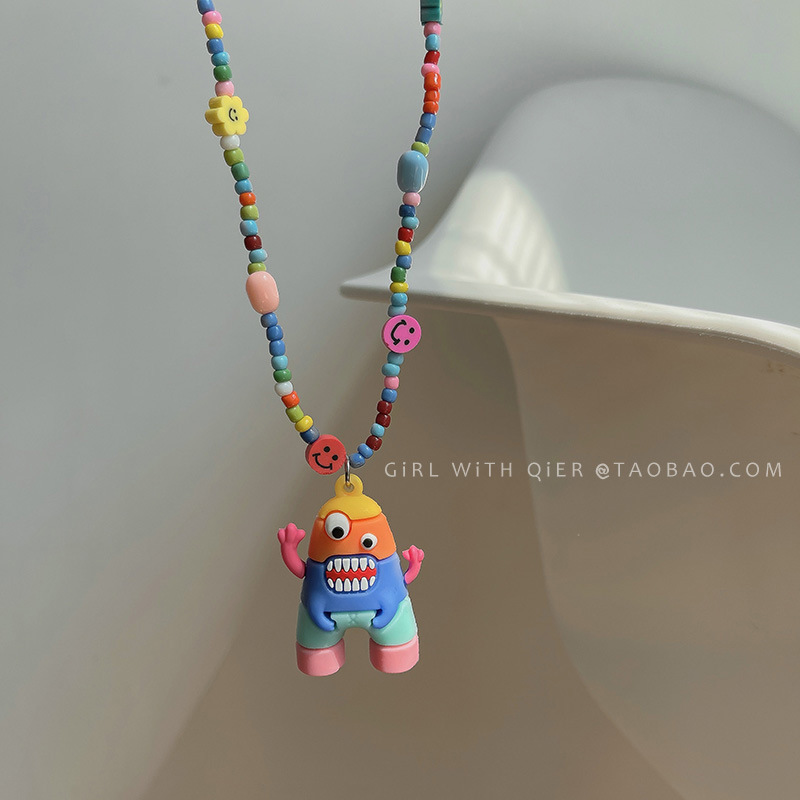 Pink Bunny Rainbow Cartoon Monster Pendant Necklace for Women, Trendy Hip-Hop Colorful Beaded Collarbone Chain for Women, Ins Style
