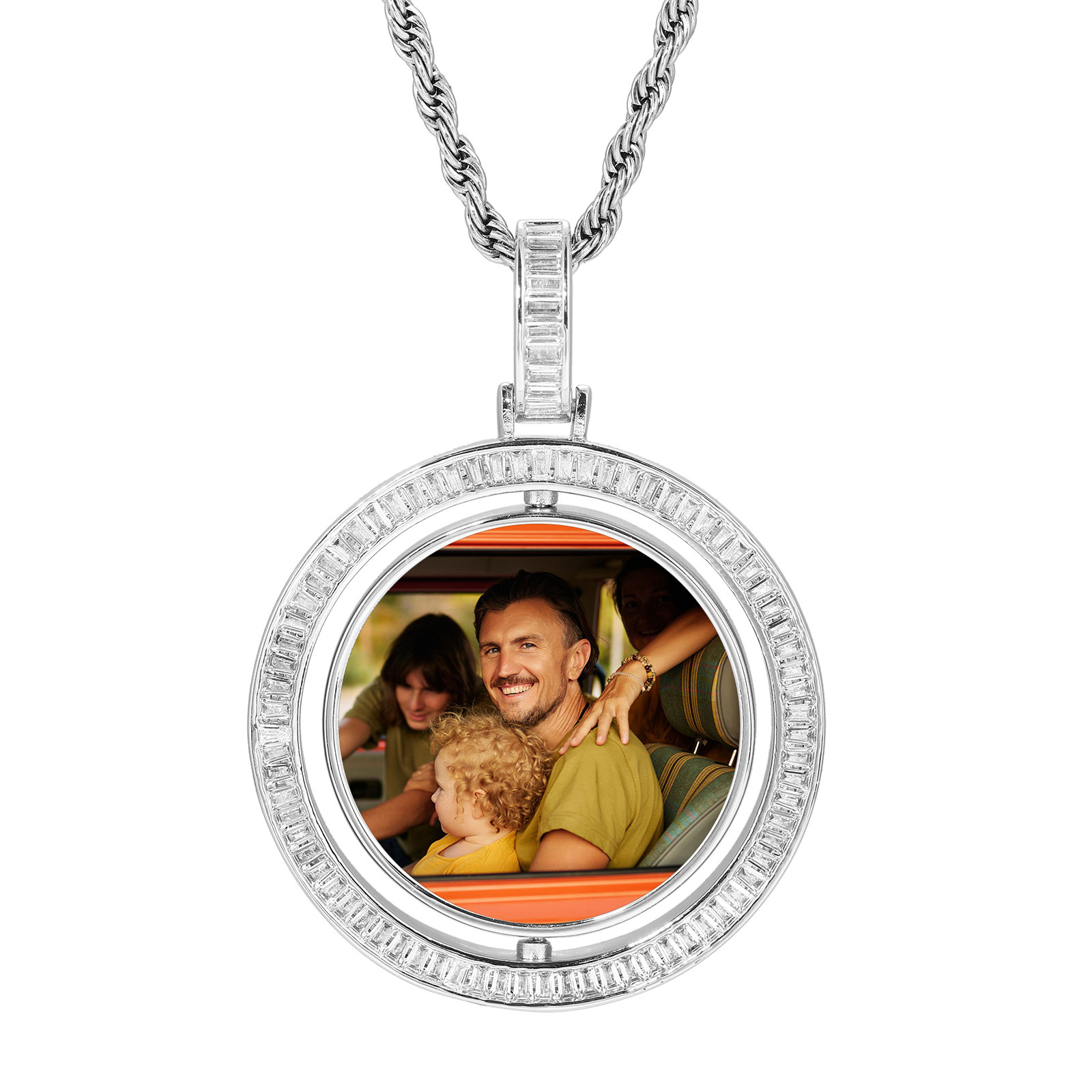 European and American Hip-Hop Commemorative Rotatable Double-Sided Round Photo Custom Pendant Copper Inlaid Zircon Personalized Photo Frame Necklace