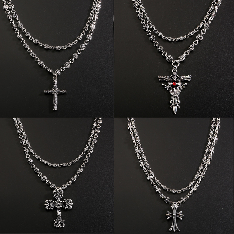 Hip Hop Nightclub Fashion Brand Cross Double Layer Necklace Handmade Chain Valentine's Day Gift Retro Imitation Silver Punk Hanging Chain