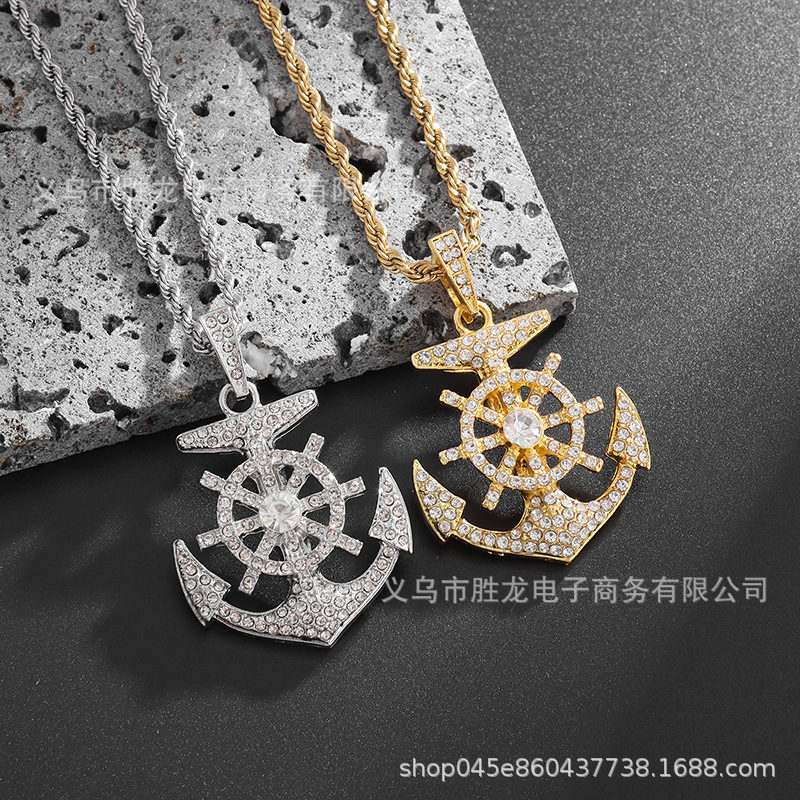 Wish Hot-Selling European and American Hip-Hop Micro-Inlaid Zircon Anchor Pendant Trendy Men's Necklace Factory Direct Sale Jewelry