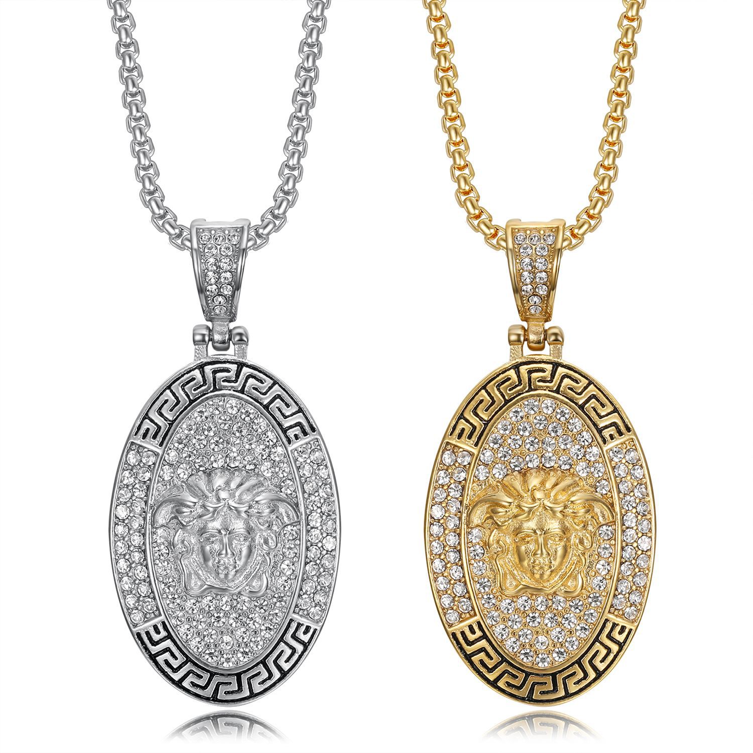 European and American cross-border new hip hop HIPHOP jewelry titanium steel gold-plated diamond oval Greek mythology pendant necklace