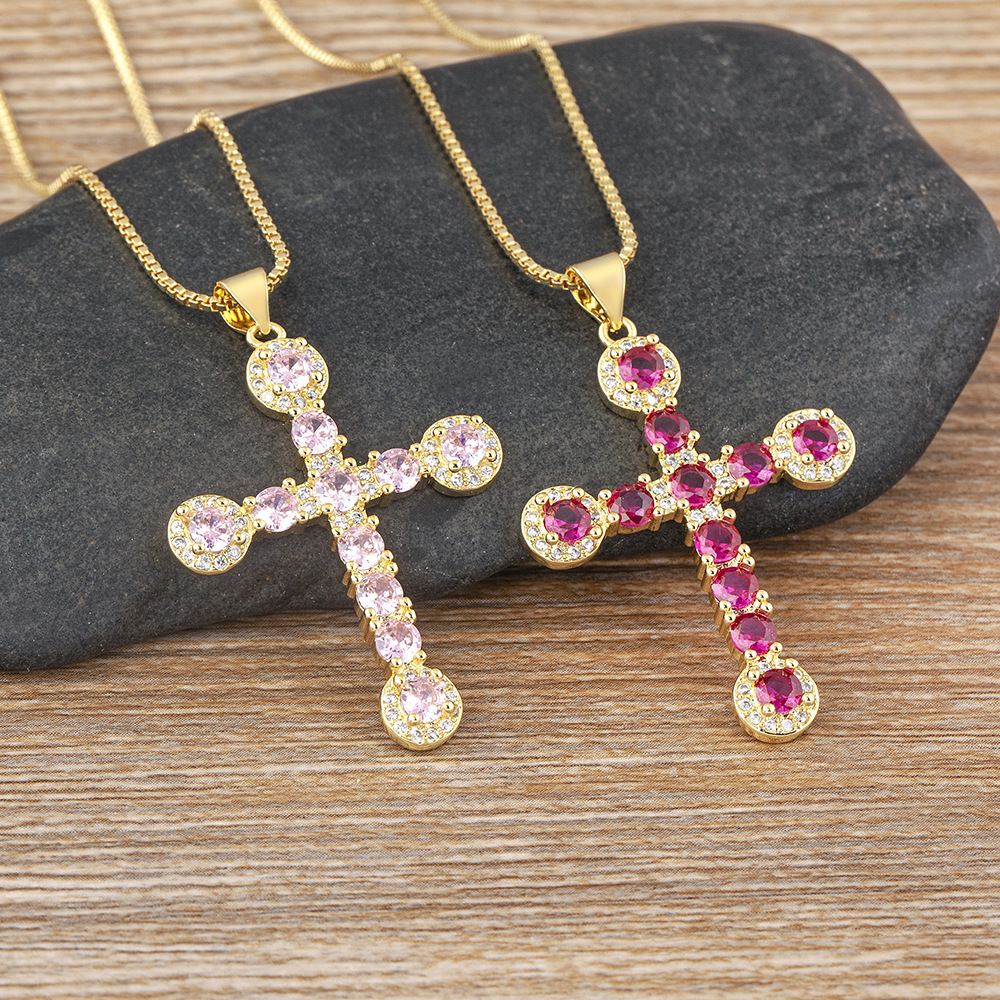 Copper Plated 18K Real Gold Hip Hop Cross Necklace Women's European and American Fashion Elegant Trend Necklace Colorful Zircon Necklace