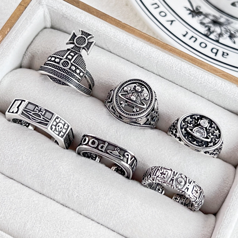 Punk Vintage Distressed Saturn Crown Opening Ring Gearless Hip-Hop Trendy Cool Personality Couple's Finger Ring Accessories