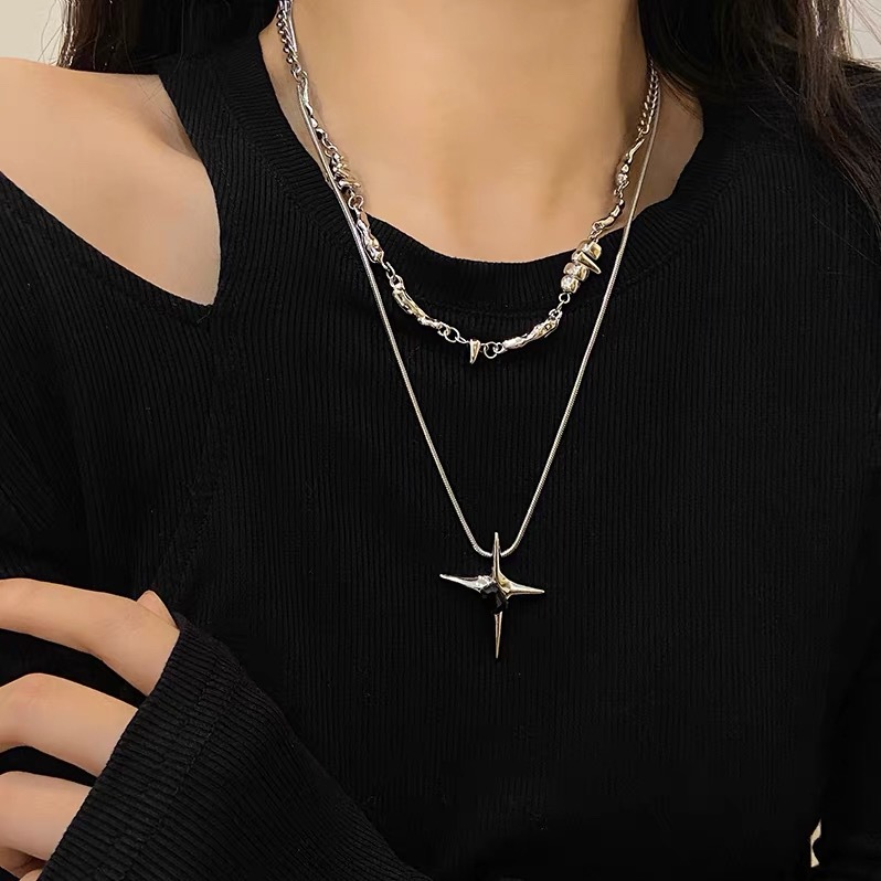 Sweet and Cool Minimalist Style Double-Layered Four-Pointed Star Necklace for Women, Unique Niche Design Choker, Hip-Hop Trendy Clavicle Chain