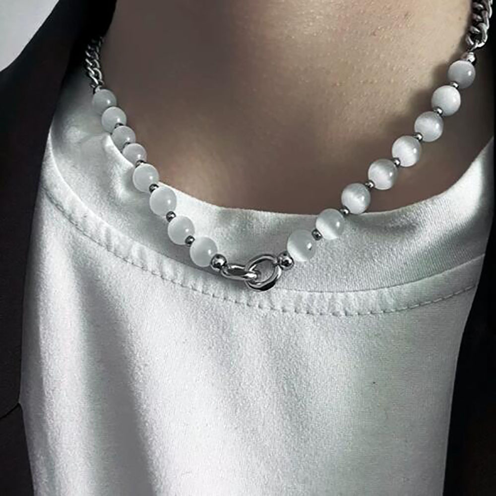 Simple Fashion Cat's Eye Beaded Titanium Steel Necklace High-grade Light Luxury Niche Cold Style Clavicle Chain for Men and Women