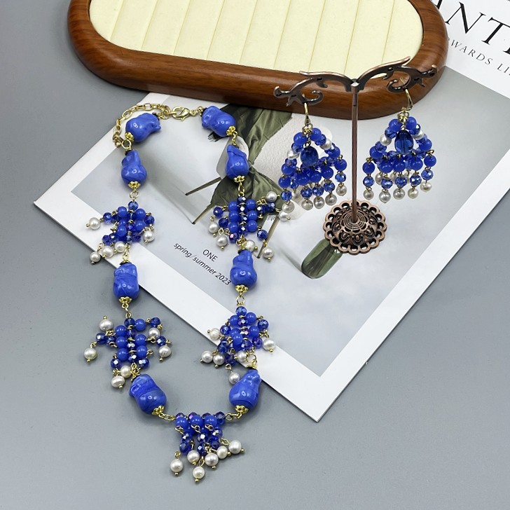 Middle Ancient vintage Vintage Blue Glazed Baroque Freshwater Drop Flower Mix and Match Heavy Industry Necklace Earrings Set