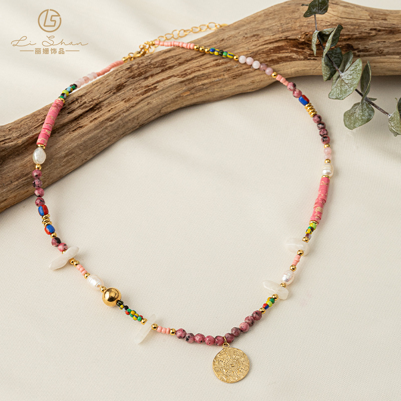 Processing and Customization of European and American Retro Style Pink Natural Stone Beaded Necklace Niche Design Freshwater Pearl Clavicle Chain