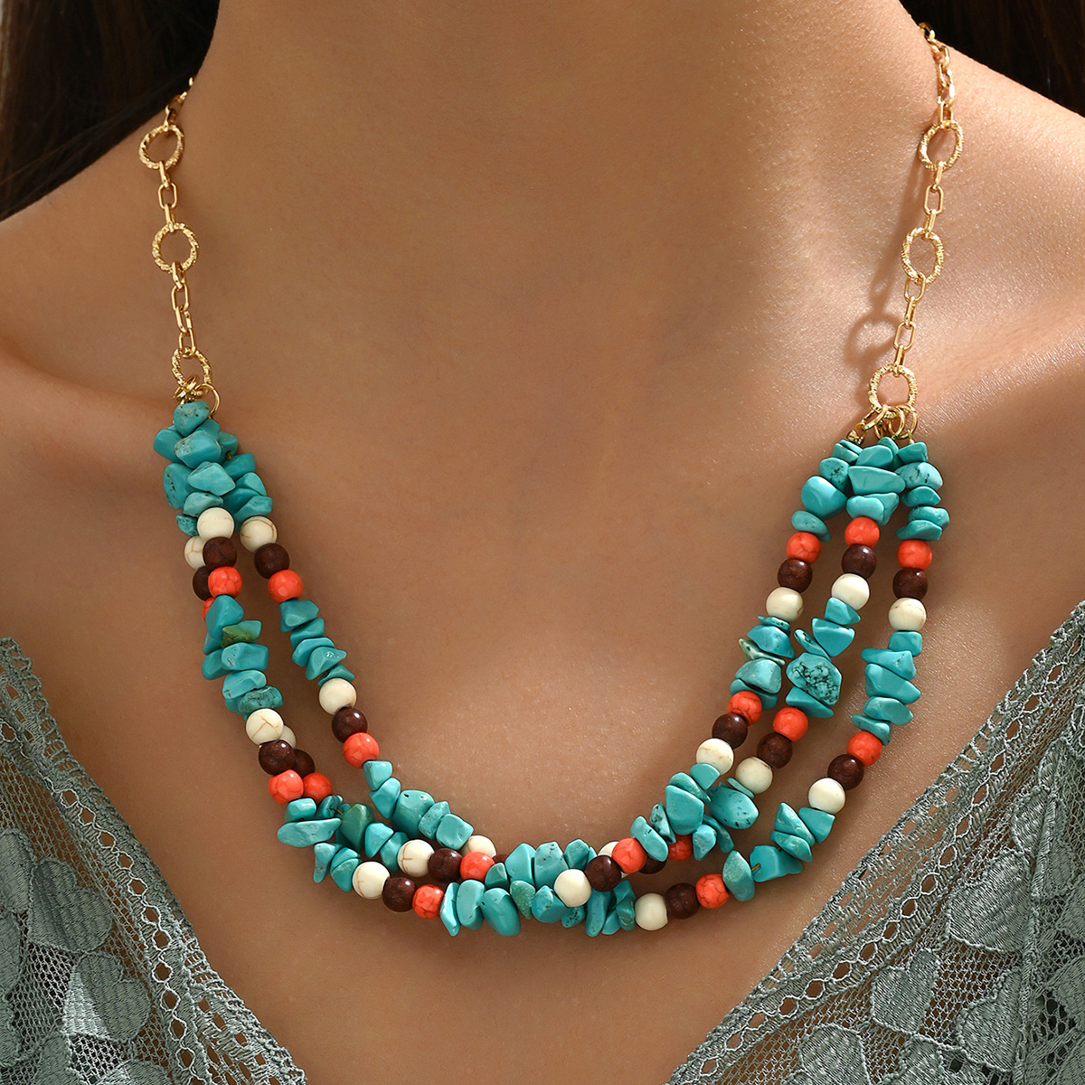 Color natural stone mix and match personalized three-layer necklace Bohemian style