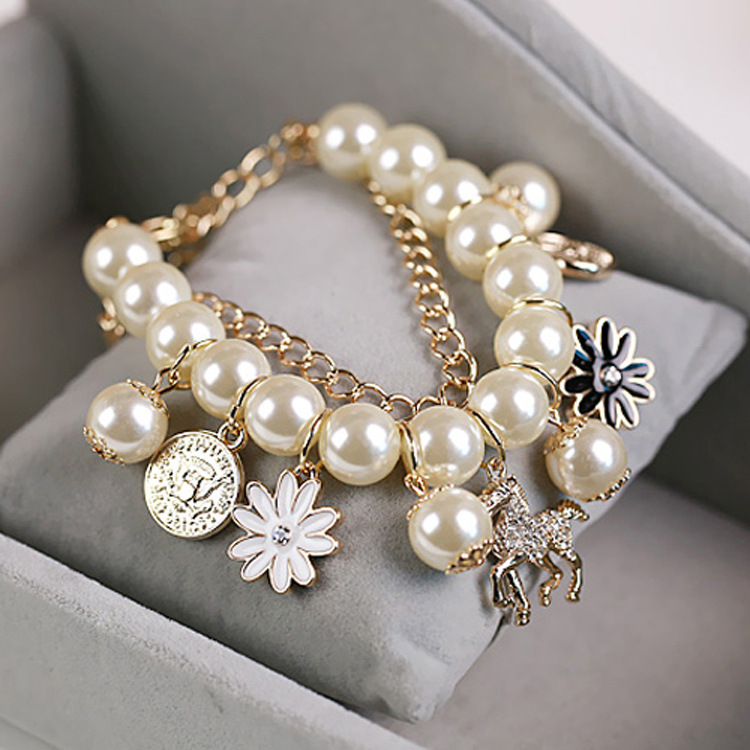 Korean Fashion Small Horse Carousel Petal Pendant Mixed with Pearls Multi-Layer Korean Style Trendy Bracelet Jewelry Wholesale Beads