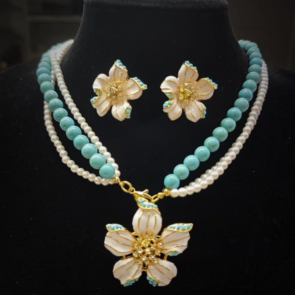 Bohemian Style Enamel Craft Turquoise Pearl Mixed Flower Necklace Earrings Fresh Women's Jewelry
