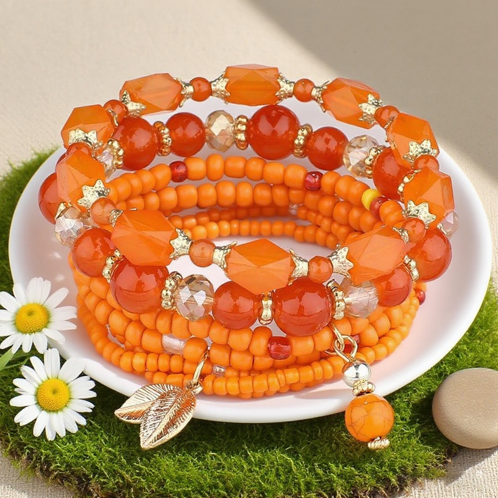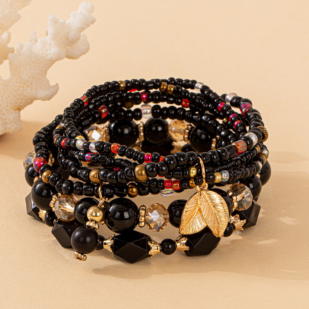 Cross-Border Hot Selling Bohemian Fashion Bracelet Gold Leaf Pendant Mixed with Rice Beads Multi-Layer Crystal Bracelet Set