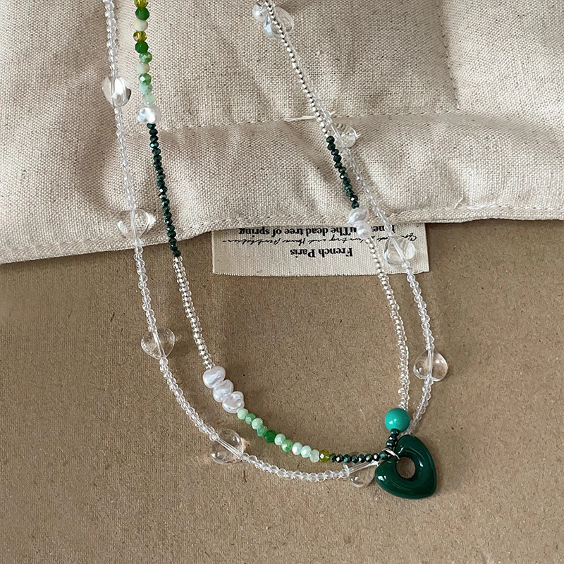 Korean Niche Ins Design Sweet Cool Dark Green Cream Heart Mixed Beaded Versatile Elegant Choker Necklace for Women