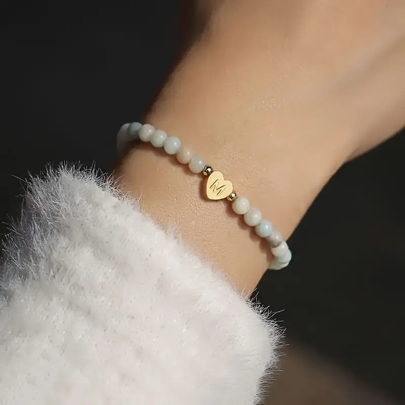 26 English A-Z Initial Letter Bracelets Copper Heart Engraved Gold-Plated Elastic Thread Beads Natural Stone Mix and Match for Women