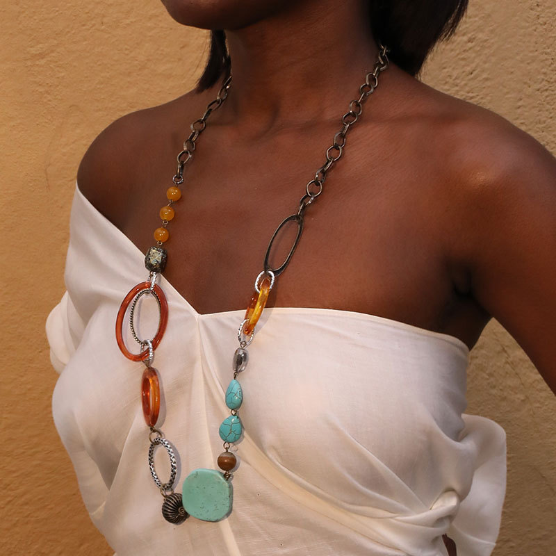 Retro Bohemian Style Colorfulful Stone Long Necklace Metal Chain Mix and Match Personalized Pendant Necklace Ethnic Style Accessories