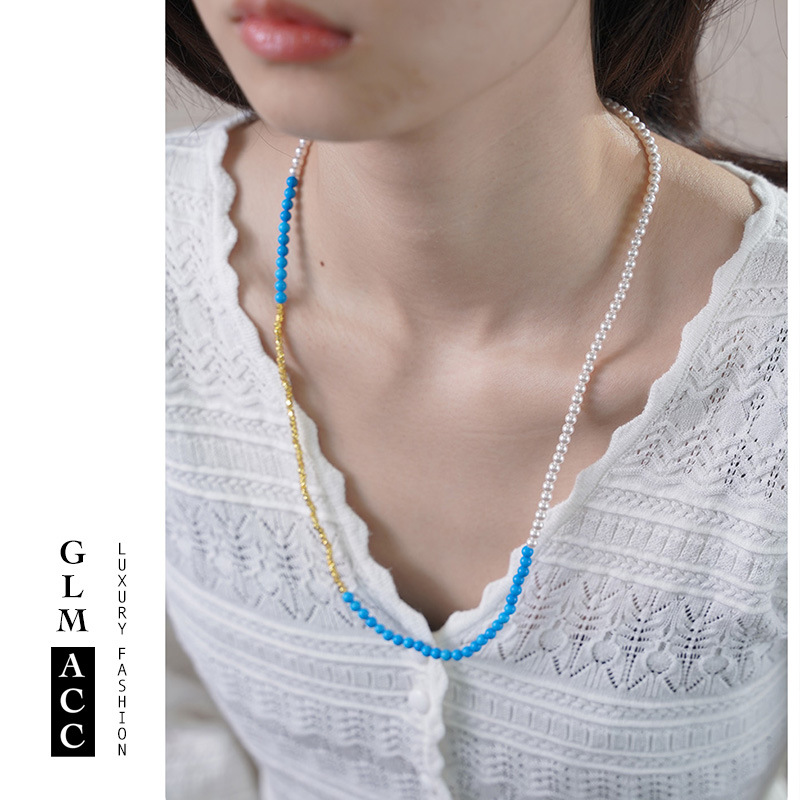 European and American French-Style Blue Turquoise Pearl Necklace with a Unique Design and a Sense of Sophistication, Layered Niche Mixed-Match Pearl Necklace for Women