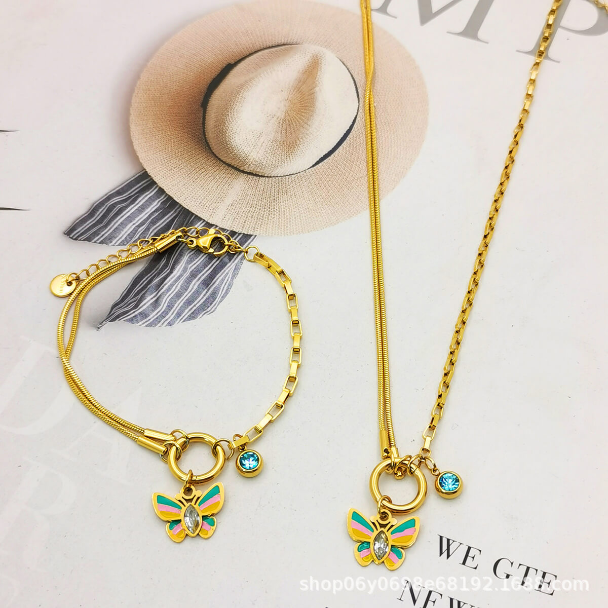Personalized Trendy Colorfulful Glue Butterfly Imitation Zircon Necklace Mixed with Snake Bone Chain Bracelet Fashionable Birthday Gift for Girls