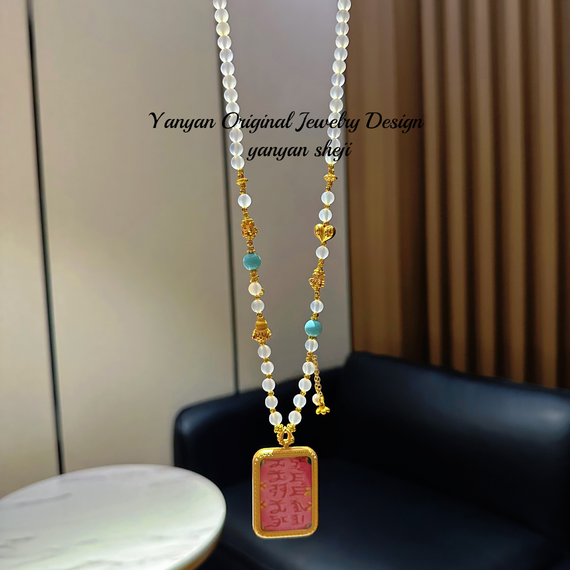 Xizang-Style New Chinese National Style Mixed Retro White Agate Hand-Painted Quicksand Thangka Pendant Necklace Versatile for Women