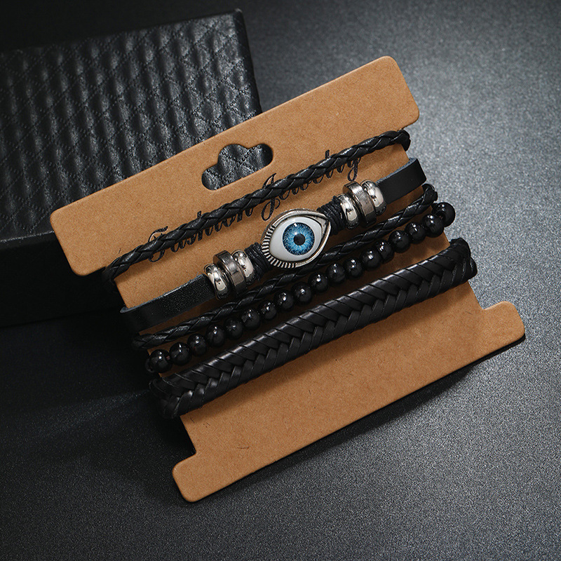 Simple Hand-Woven Devil's Eye Bracelet DIY 3-Piece Set Mixed with Leather Beads Creative Jewelry