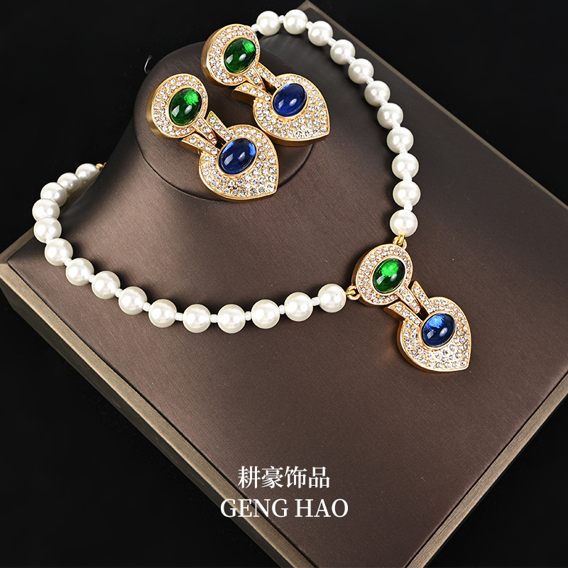 Vintage Palace Style Simple Trend White Beaded Blue and Green Mix and Match Czech Diamond Inlaid Necklace Earrings suit