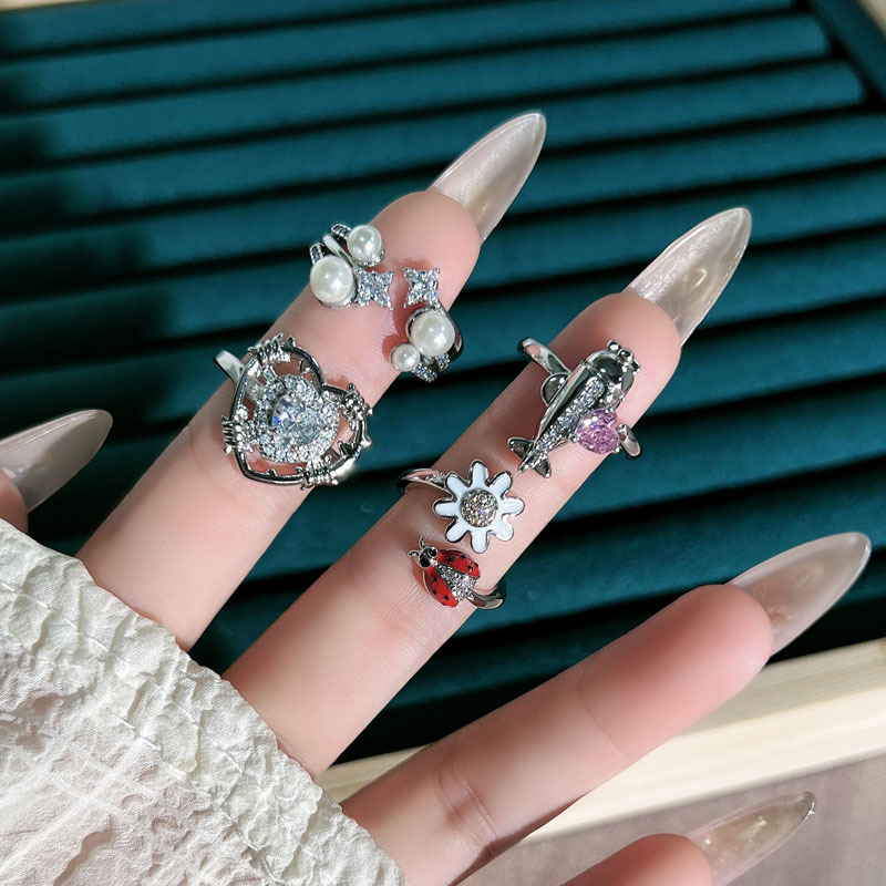 French-Style Mixed Pearl Starburst Temperament Ring for Women, Geometric Heart Airplane Unique Design Fashion Versatile Ring