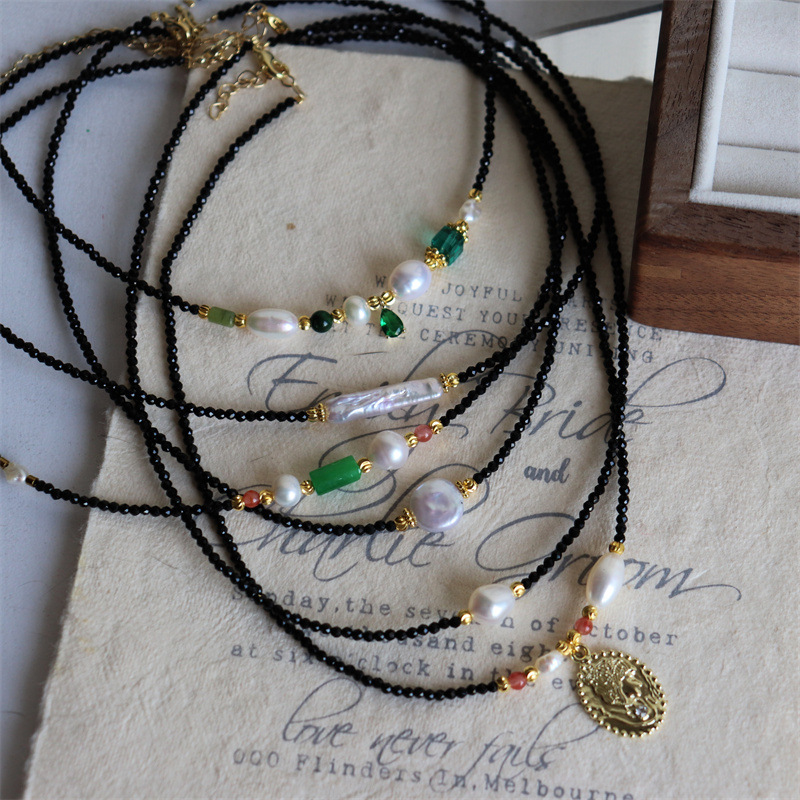 suu Design Freshwater Pearl Small Silver Strip Mix and Match Black Pointed Crystal Jade Necklace Original Pearl Necklace