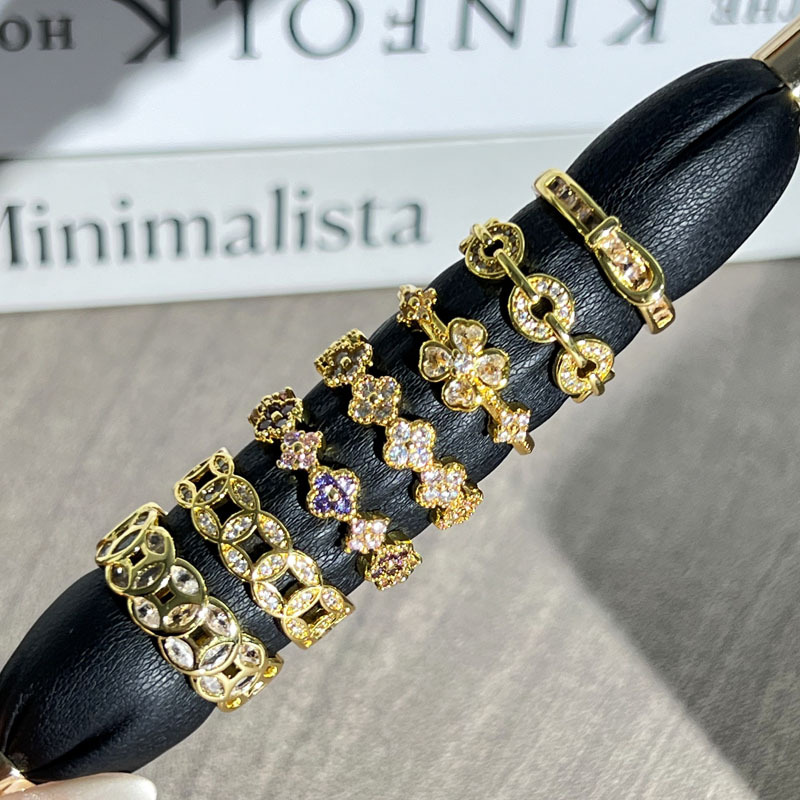 Mix and Match Multi-Element Full Diamond Four-Leaf Clover Copper Coin Light Luxury Open Ring for Women European and American Minimalist Fashion Niche Ring