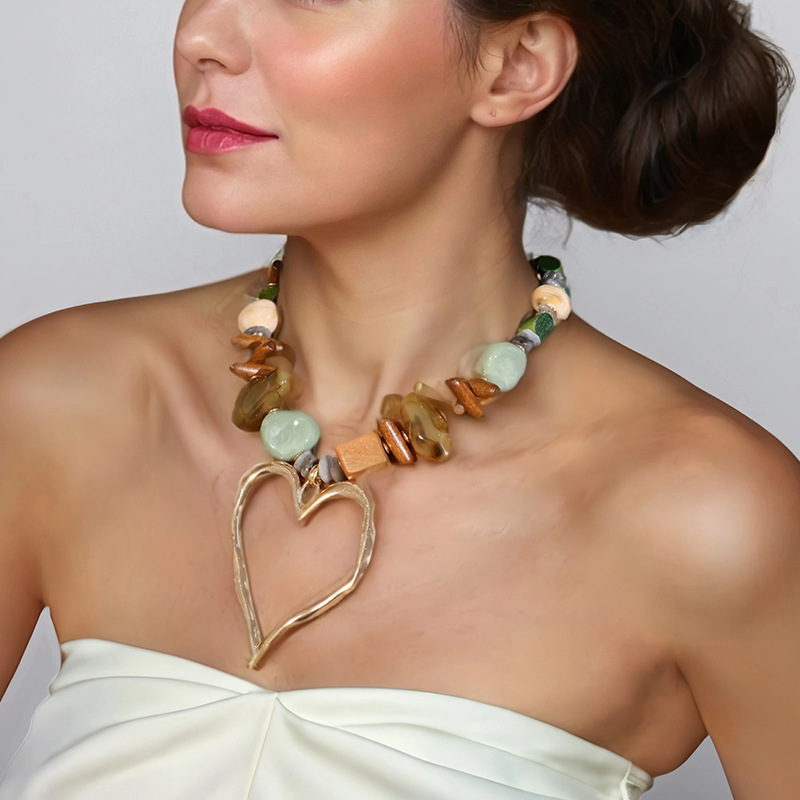 Cross-Border Original New Bohemian Style Necklace Stone and Wood Mix and Match Golden Heart-Shaped Pendant Clavicle Chain Accessories