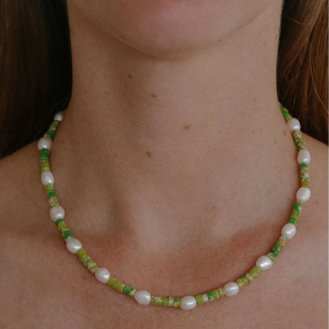 Autumn and Winter New Moss Green Semi-precious Stone Necklace Chain Ins Colorful Stitching Clavicle Chain Simple Freshwater Pearl Necklace Overlapping