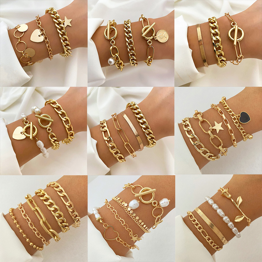 European and American Multi-Layer Metal Alloy Chain Bracelet Personalized Mix and Match Set Hand Ornaments Five-Pointed Star Disc Heart Bracelet for Women