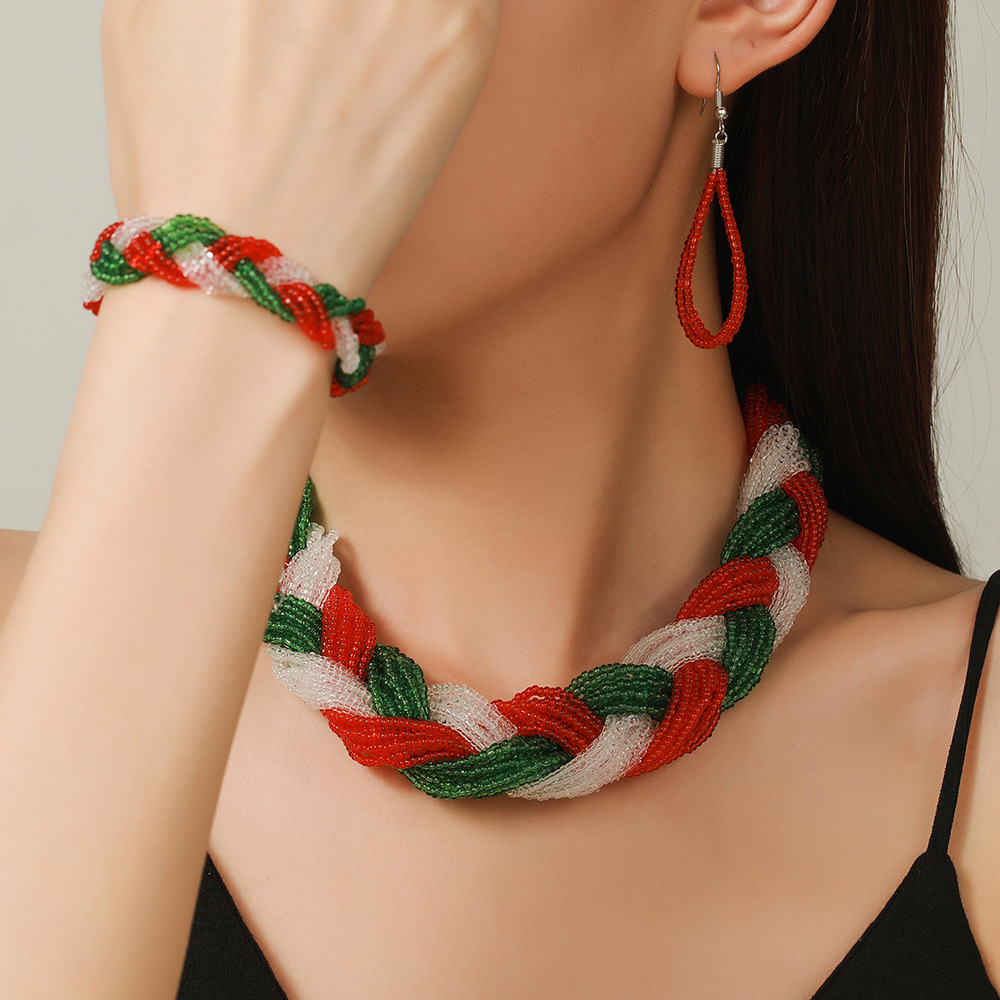 Cross-border Hot Exaggerated Necklace Halloween Red and Green Mix Necklace Rice Bead Woven Necklace Foreign Trade Jewelry suit