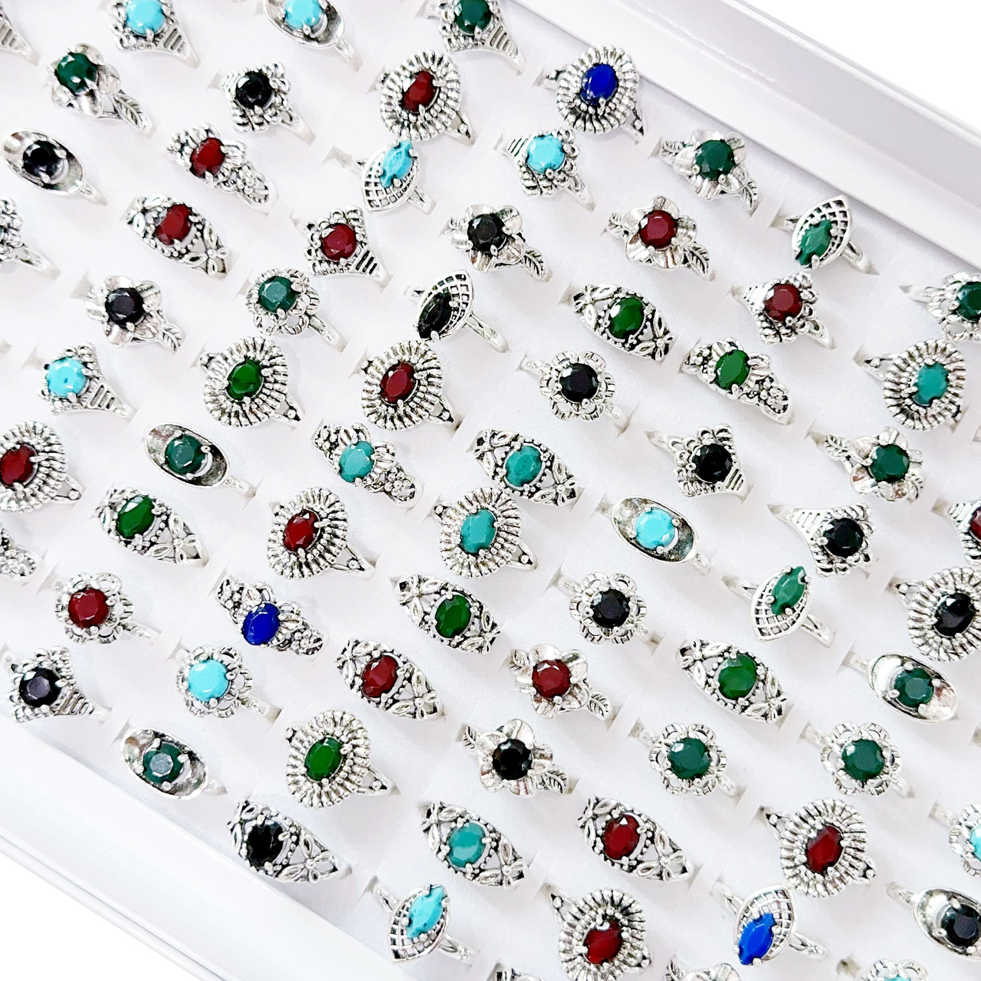 Cross-Border Spot Direct Sales European and American Fashion Antique Silver Plated Women's Rings, Multi-Style Colorful Stone Rings Boxed Mix and Match Wholesale