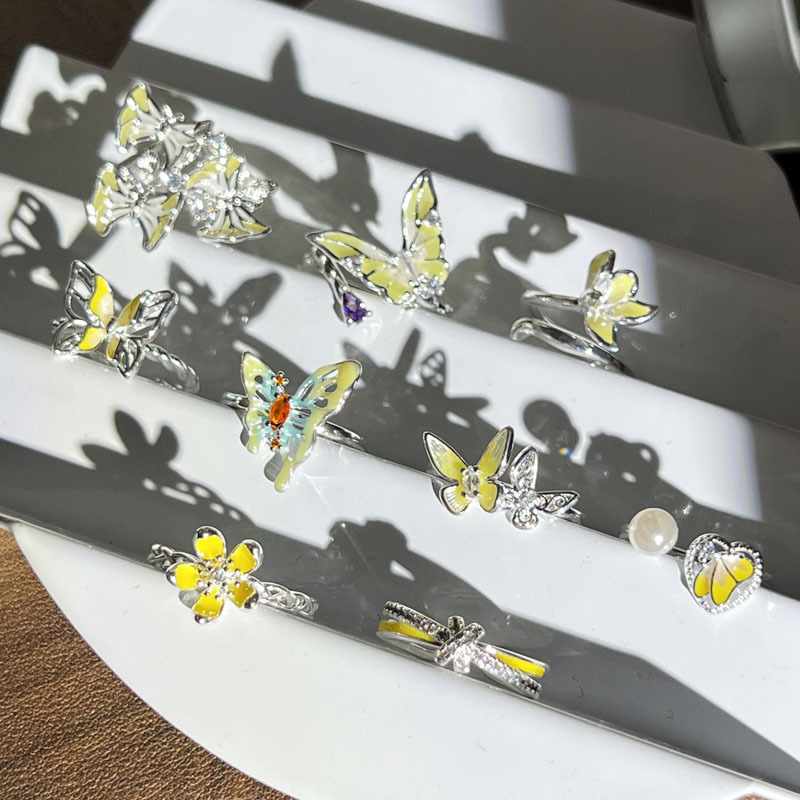 Forest-Style Yellow Drip Glaze Butterfly Flower Korean Version Trendy Mixed Open Ring for Women Niche Light Luxury High-End Index Finger Ring
