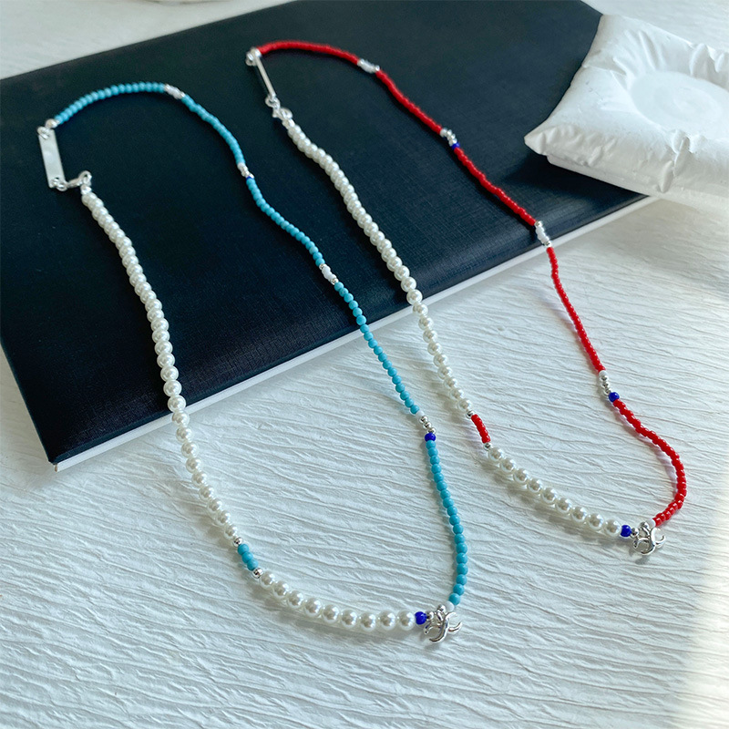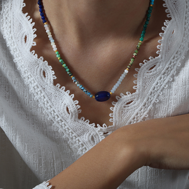 Sunflower Ouni's Same Style Blue Turquoise Hand-Beaded Clavicle Chain Women's Niche Mix and Match Stacked Pearl Necklace Accessories