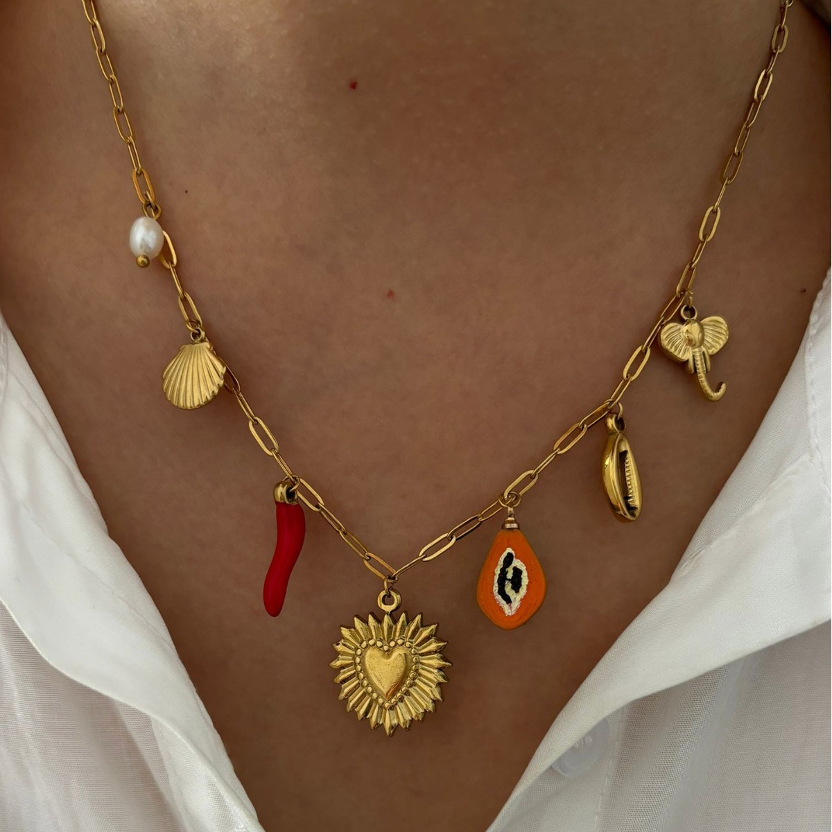 Retro European and American Fashion Mix and Match Titanium Steel Love Shell Pepper Drop Oil 18K Gold Bohemian Style Women's Necklace