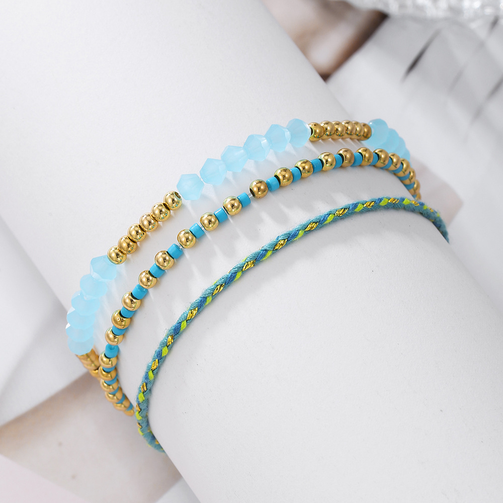 Bohemian Style Summer Clear Blue Beaded Bracelet, Niche Stacking Design with Mixed Gold Bead Bracelets
