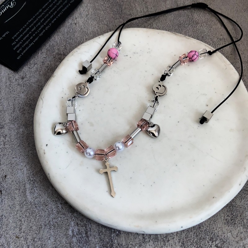 Fashion pink round bead smiley face square crystal beaded cross clavicle chain light luxury trendy mixed pull necklace